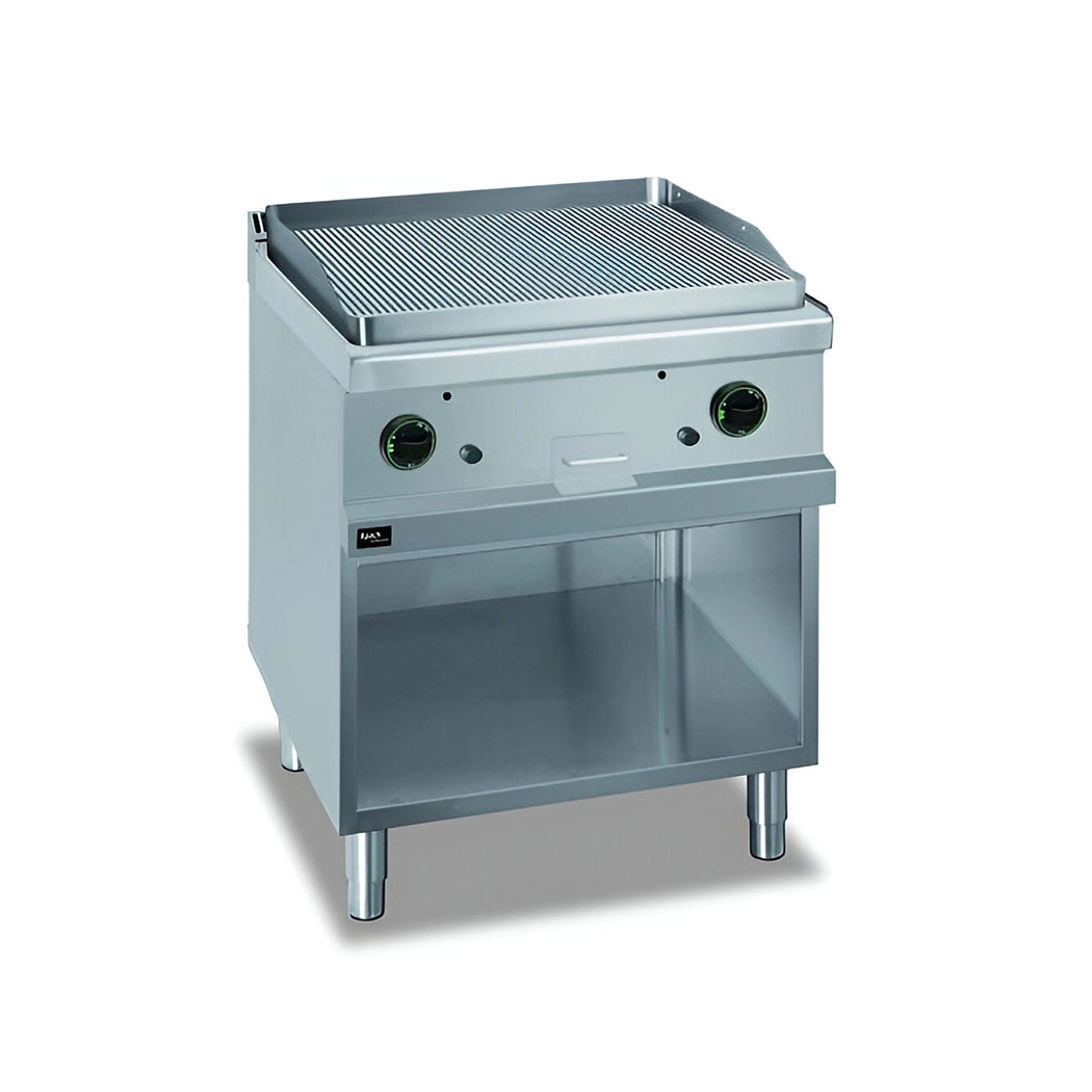 The APACH 700 Series Electric Fry Top APTE-77PR/PL is ideal for hotel and restaurant kitchens. It has a 65x57 cm ribbed frying surface (15 mm thickness) and two independent heating zones. It has a removable 2-liter stainless steel grease tray, 3 mm stainless steel splash guards, and a strong housing constructed of AISI 304 and AISI 430 stainless steel. In professional cooking situations, it is mounted on an open cabinet base with movable feet to ensure stability and mobility.