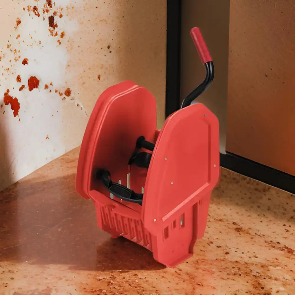 The Polypropylene Strong Wringer with a down press mechanism comes in vibrant colors such as red, yellow, and green. It features durable nylon gears and a sprinkling guard, ensuring efficient water removal during mopping tasks. The wringer is equipped with a support handle and lateral protection set, along with a rubber thickness gauge for optimal performance. Its sturdy construction makes it ideal for heavy-duty use in various cleaning applications.