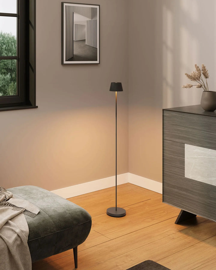 The outdoor floor lamp SEOUL made of coated aluminium sets stylish accents. Whether in the garden, on the balcony or in the flat. Thanks to the IP65 protection class, the small lamp is an all-rounder for every occasion. The built-in, infinitely variable touch dimmer on the top of the lamp allows a convenient change of light intensity and colour temperatures. After a battery runtime of up to 62 hours, the SEOUL is recharged in a user-friendly way thanks to the charging station.