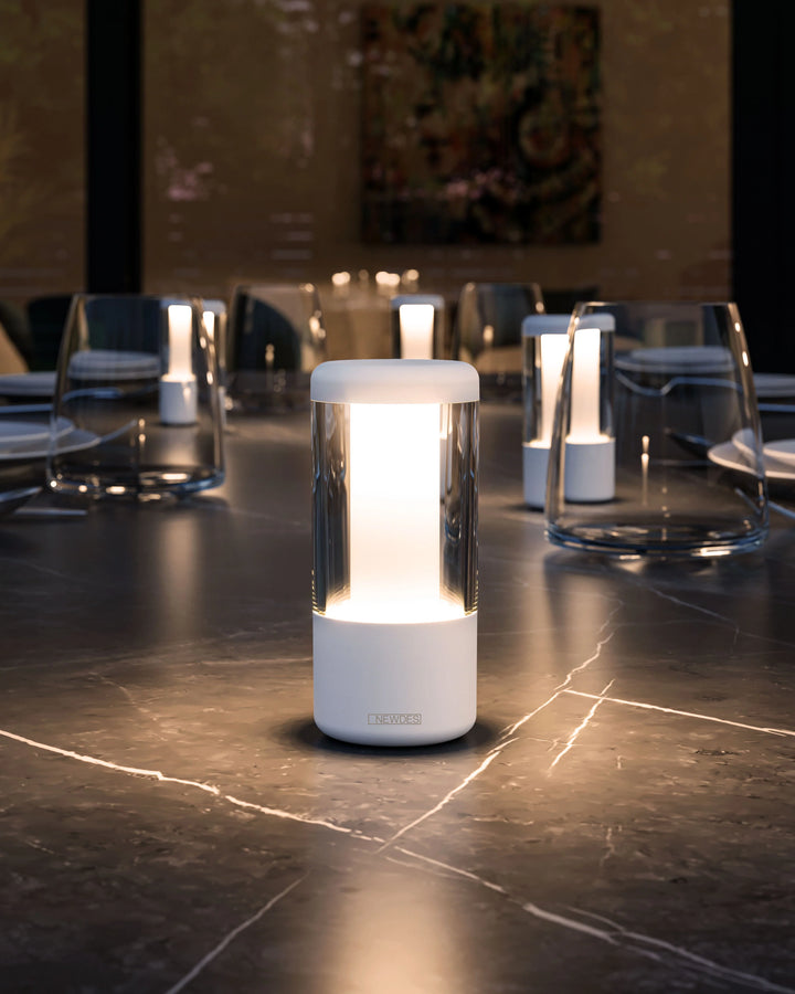 Made from recycled aluminum, these lights combine style and sustainability. The set includes a multi-charging station that offers space for all four NIP lights. Ideal for hotels, restaurants, as well as for use in the home and garden.