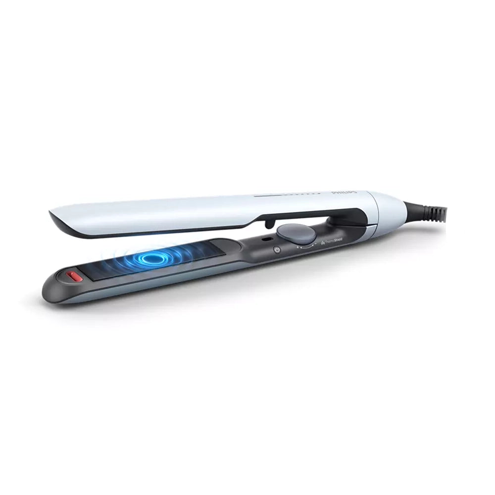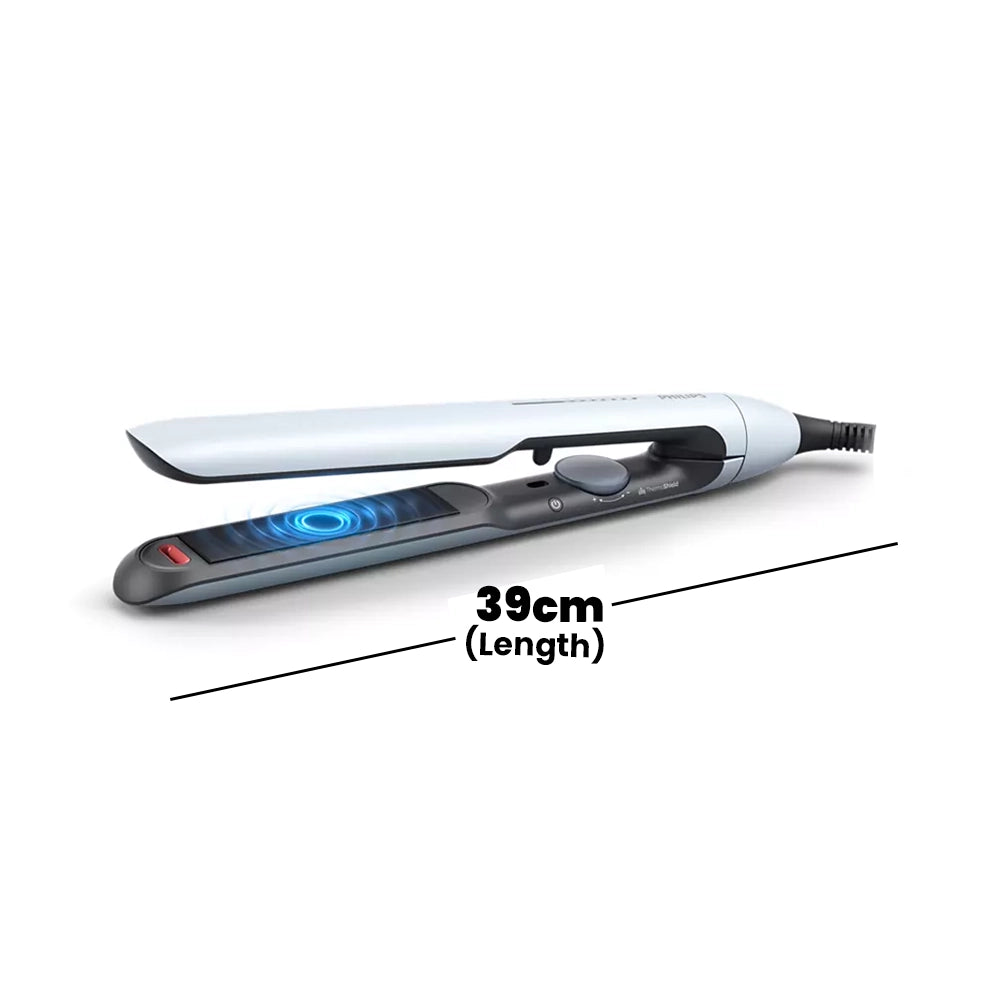 The Philips 5000 Series Thermoshield Hair Straightener will help you achieve beautiful, frizz-free hair. Take advantage of 50% faster straightening and 2X Ionic care. This cutting-edge straightener has dual ionization for glowing hair, ceramic plates filled with argan oil, and ThermoShield technology. Savor the benefits of rapid heating, silky glide, and ideal style temps for glossy, silky hair.