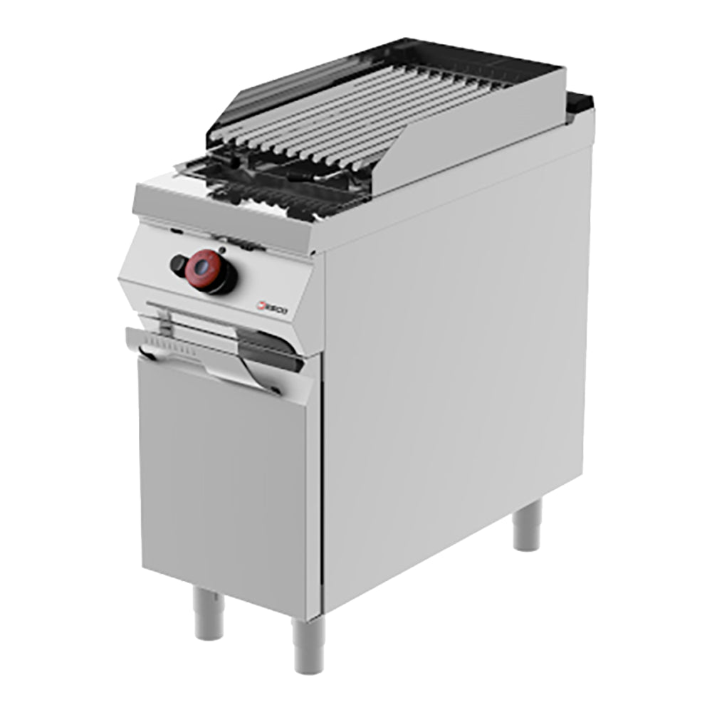 The Desco GPG91M0 Gas Lava Stone Grill with Hinged Doors is a robust and efficient grill designed for professional kitchens. This high-performance appliance uses lava stones for even heat distribution, making it ideal for grilling meats, vegetables, and seafood with exceptional results. Its sturdy construction and practical design make it a great choice for commercial use in restaurants and catering establishments.