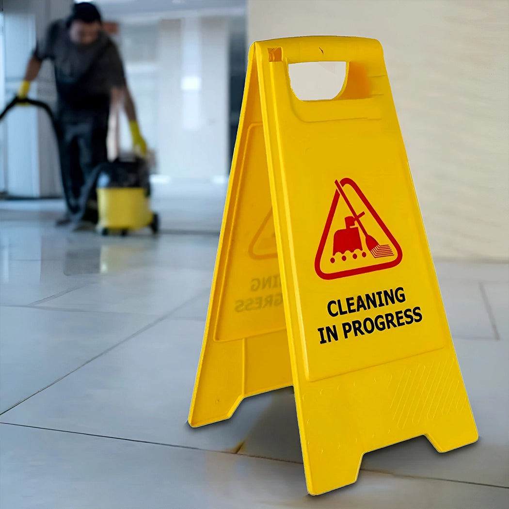 • 'Cleaning in Progress' sign printed on both sides for effective communication of temporary hazards.
