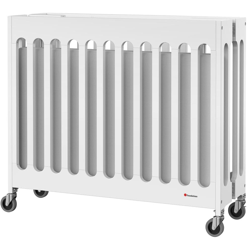 Discover the Foundations Boutique Compact Folding Crib in stylish white 40" x 25" x 35", a space-saving solution that combines convenience and elegance. This Folding Crib is perfect for smaller spaces and busy parents on the go. Experience portability, versatility, and comfort for your baby while maximizing your nursery space with this modern Grey crib.