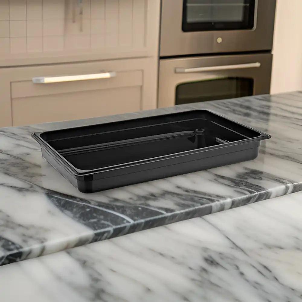 This black GN container from Rubber Plas Tech brings both style and functionality to your kitchen. It is crafted from super strong, crack-resistant plastic, it tackles everyday wear and tear with ease. The lightweight plastic stays cool even with hot food, making it comfortable to handle. No need for separate hot and cold containers - this one tackles both freezing and boiling temperatures. Cleaning is a breeze as it's dishwasher safe! Plus, they stack neatly to save space in your kitchen. This container is perfect for both professional kitchens and home cooks looking for a touch of style.