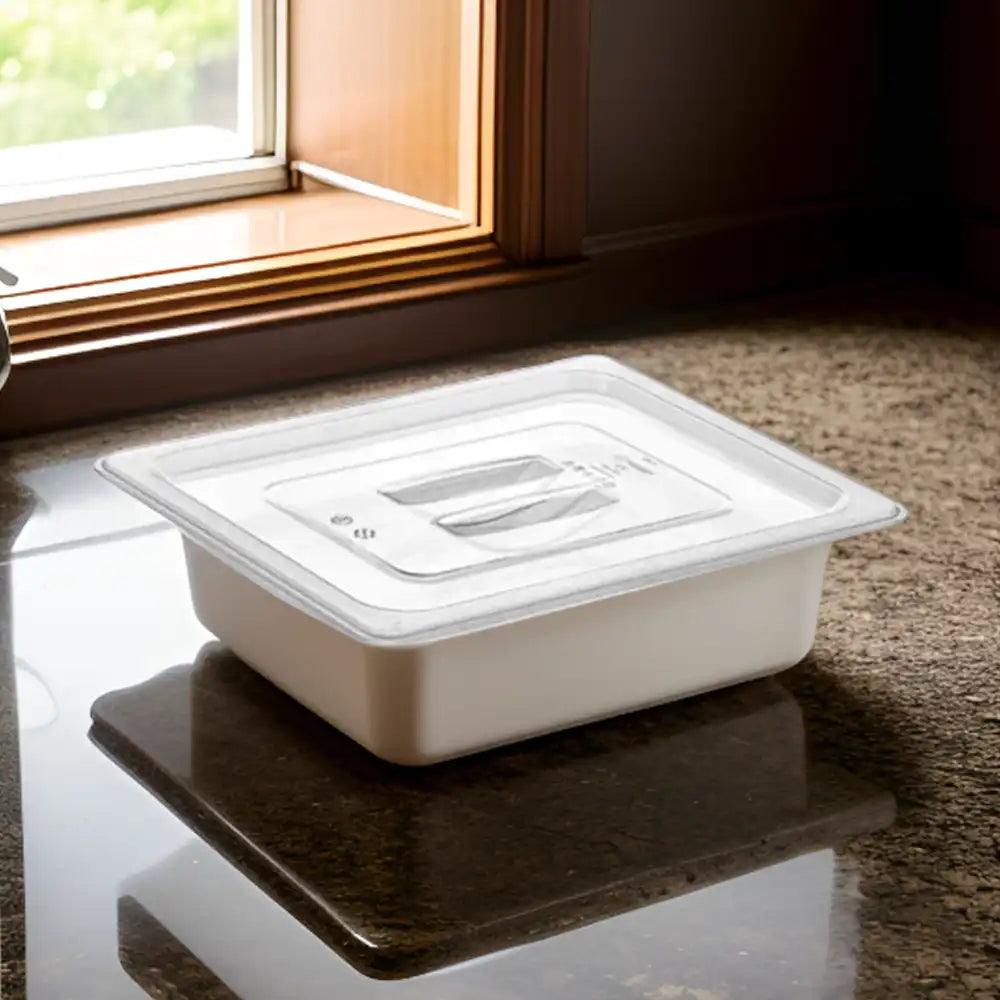 This clear lid from Rubber Plas Tech fits container perfectly. It's made from strong plastic that won't crack easily. See your food right away without opening the container - it's transparent! No need for separate lids for hot or cold food - this one handles it all, from freezing to boiling (-30°C to 100°C). Easy to clean and dishwasher safe, this lid also helps prevent spills. Keeps your food fresh and your kitchen organized.