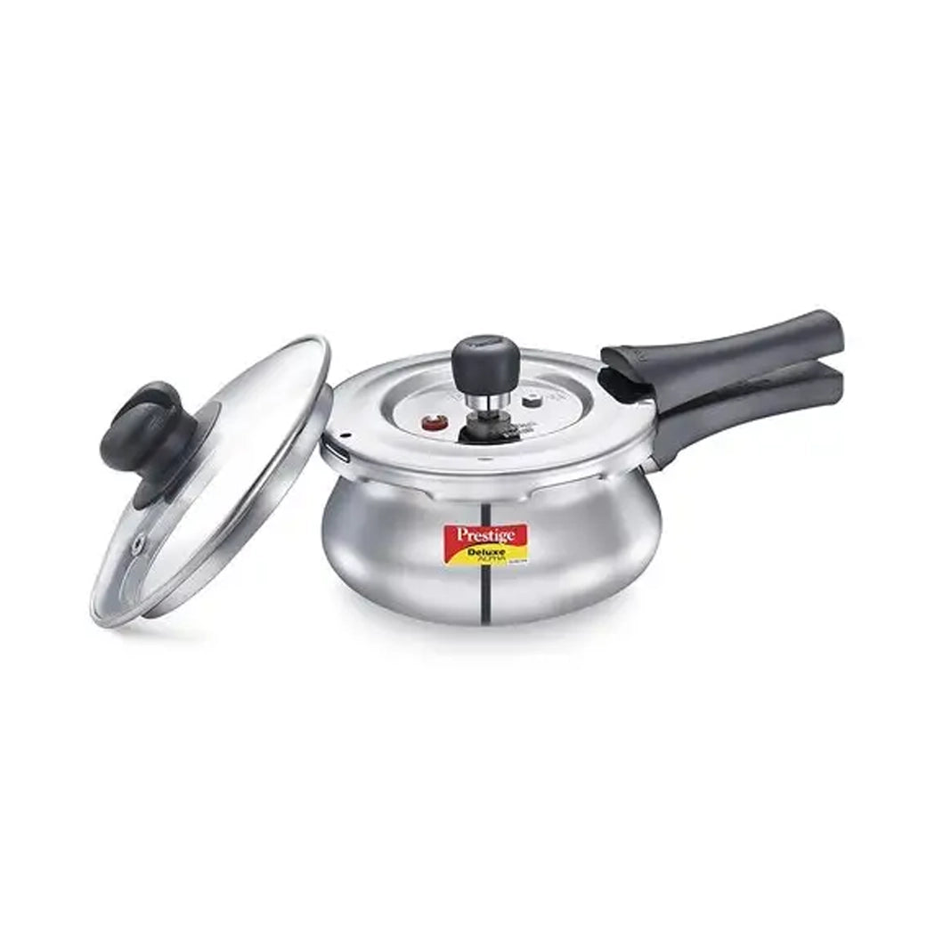 Introducing the Prestige Stainless Steel Svachh Deluxe Alpha Cooker. With dimensions of H34xW20xD13, this cooker is excellent for professional kitchens in hotels, restaurants, and catering businesses. It has a distinctive deep lid that prevents spills, a small metallic safety plug, a unique pressure indication, a controlled gasket-release system, sturdy handles, and high-quality grade-304 stainless steel, all constructed around a unique Alpha foundation. Its durability and superior safety features make it ideal for high-volume cooking.