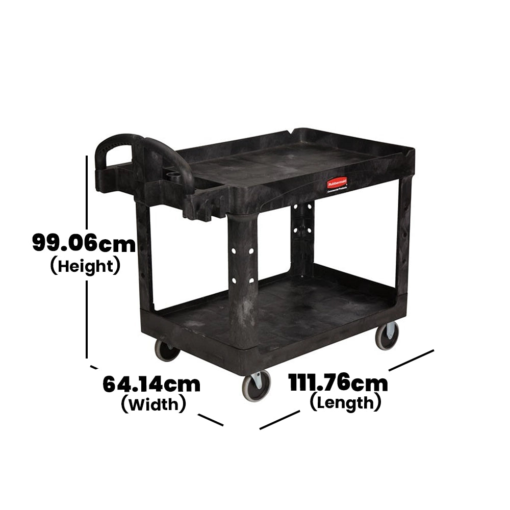 Expertly designed for the rigorous demands of the hospitality and catering sectors, this Rubbermaid utility cart combines durability, ergonomics, and multifunctionality. Constructed from sturdy polypropylene, it effortlessly withstands chips, dents, and peeling. Its dimensions, W64.14 x H99.06 x D111.76cm, and a maximum load capacity of 226kg make it robust enough for heavy loads while the ergonomic handle and rounded corners uplift safety and mobility.