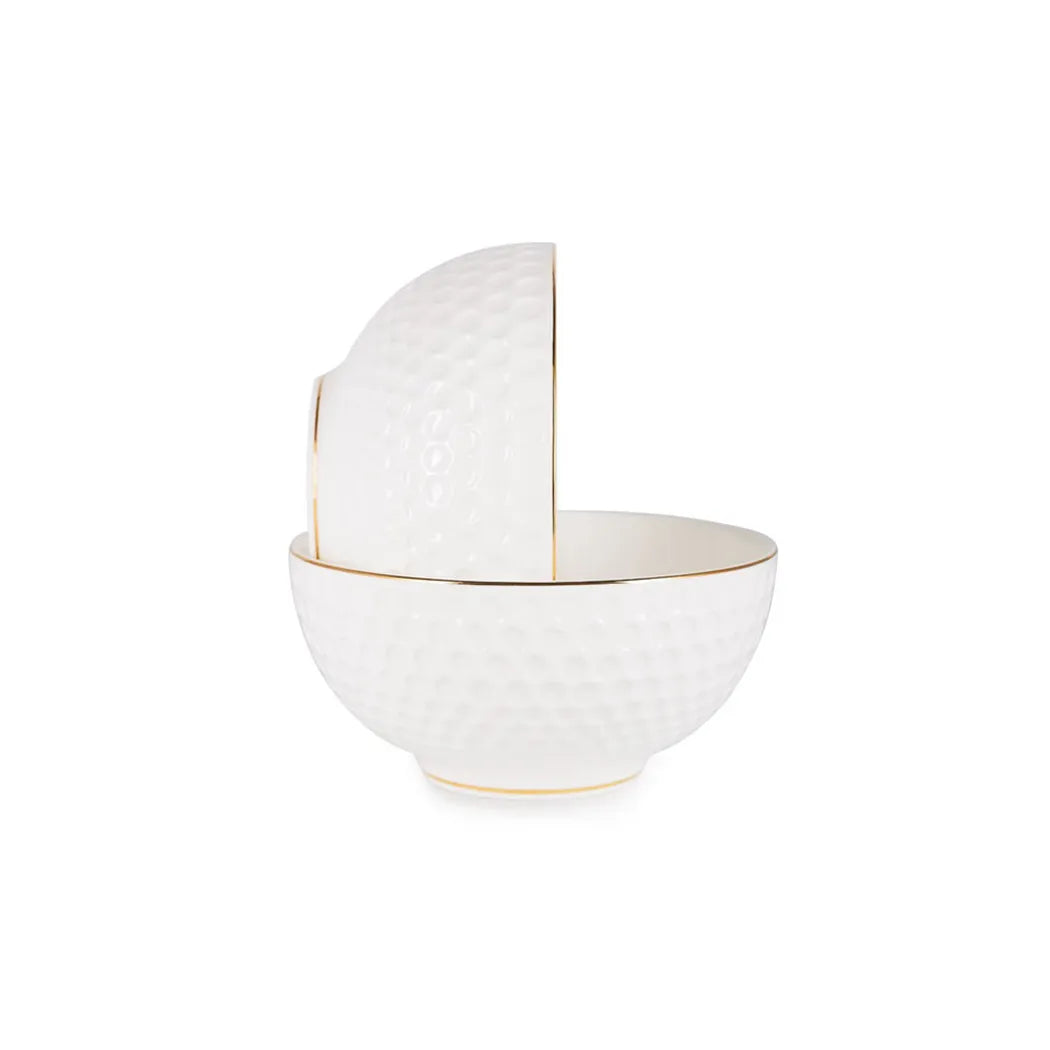 Presenting the Fissman NOEMI Fine Bone China Bowls, crafted from authentic Chinese bone china in a timeless snow-white hue with elegant gold accents. Each bowl features a geometric pattern that enhances its beauty, making it suitable for various hospitality settings. With a 340 ml capacity, these bowls are versatile for serving soups, desserts, or side dishes with style and durability. The glazed surface ensures easy maintenance and resilience against odors and stains. Packaged in vibrant boxes, they make perfect gifts and complement other pieces in the NOEMI collection, maintaining a cohesive and sophisticated dining experience.