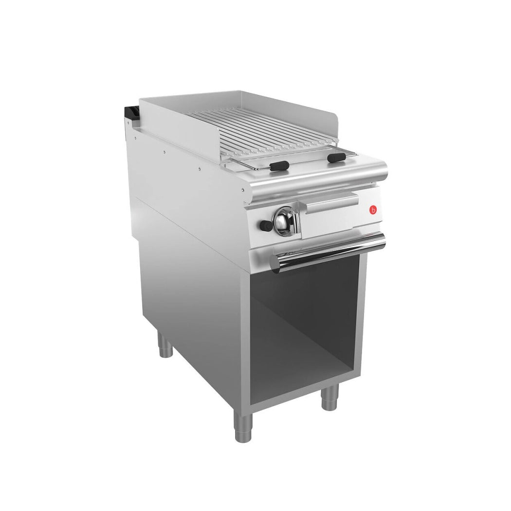 The Baron 700 Series Gas Lava Rock Grill on Open Stand is a high-performance cooking solution for commercial kitchens. Its stainless steel burners and lava rock heat retention provide high-heat cooking and smoky flavor. With a removable fat collection drawer and adjustable feet, this grill offers easy cleaning and stable installation. Ideal for restaurants, cafes, and food establishments, it's perfect for cooking a variety of dishes with high efficiency and flavor.