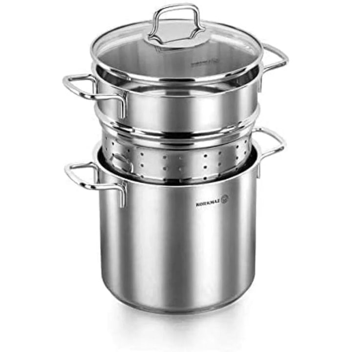 The Korkmaz Perla Spaghetti Set, with a 5.1-liter capacity, is perfect for the hospitality industry. Its Solar Base system ensures maximum time and energy savings on all hob types, including induction. The super capsule base provides homogeneous heat conduction for even cooking. Featuring carefully polished exterior surfaces that retain their shine, this set is both durable and easy to clean. The ergonomic, hand-free, special safe stainless steel handles and tempered glass cover add convenience and safety. Ideal for large portions, this spaghetti set combines efficiency and elegance, making it a valuable addition to any professional kitchen.