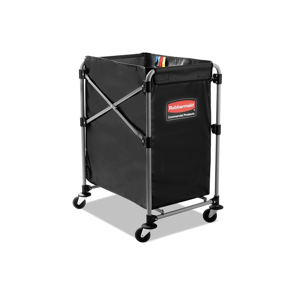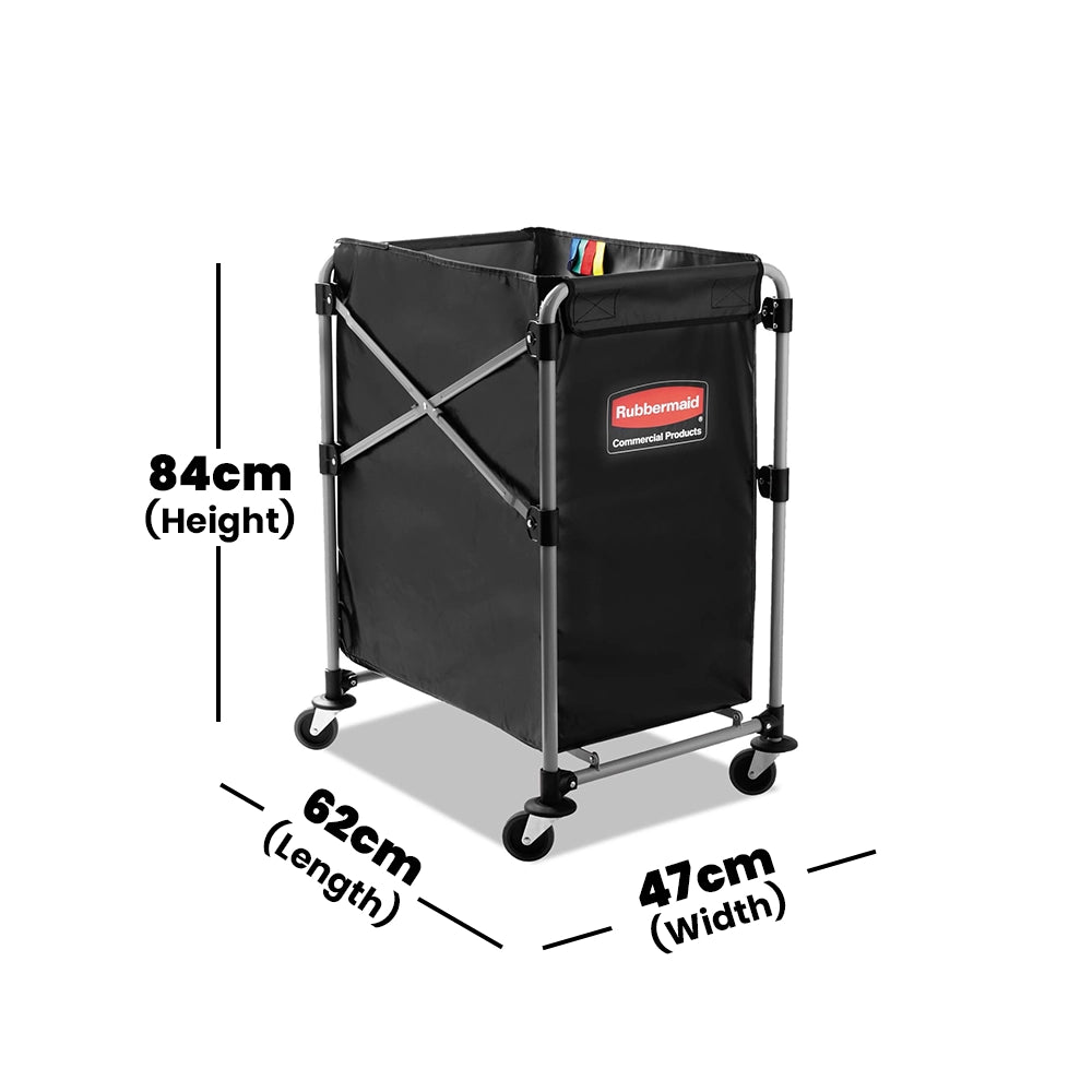 Designed exclusively for the hospitality industry, the Rubbermaid 4-Bushel X-Cart melds durability with style. This 150L collapsible cart boasts a robust stainless steel, powder-coated frame, adept at effortlessly transporting items. Its dimensions, 47cm x 62cm x 84cm, ensure a fit through standard doorways and corridors, enhancing utility in busy hotel, restaurant, and catering environments.