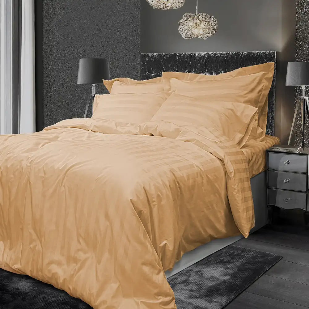 Designed to meet the rigorous standards of the hotel, restaurant, and catering industry, the Eternal Stripes King Cotton Flat Sheet emerges in a luxurious gold, illustrating elegance and comfort. Crafted from 100% cotton sateen for a silky soft feel and sized at 260X280 cm, this gold flat sheet is both wrinkle-free for effortless maintenance and perfect for enhancing the guest experience with its chic, timeless design.