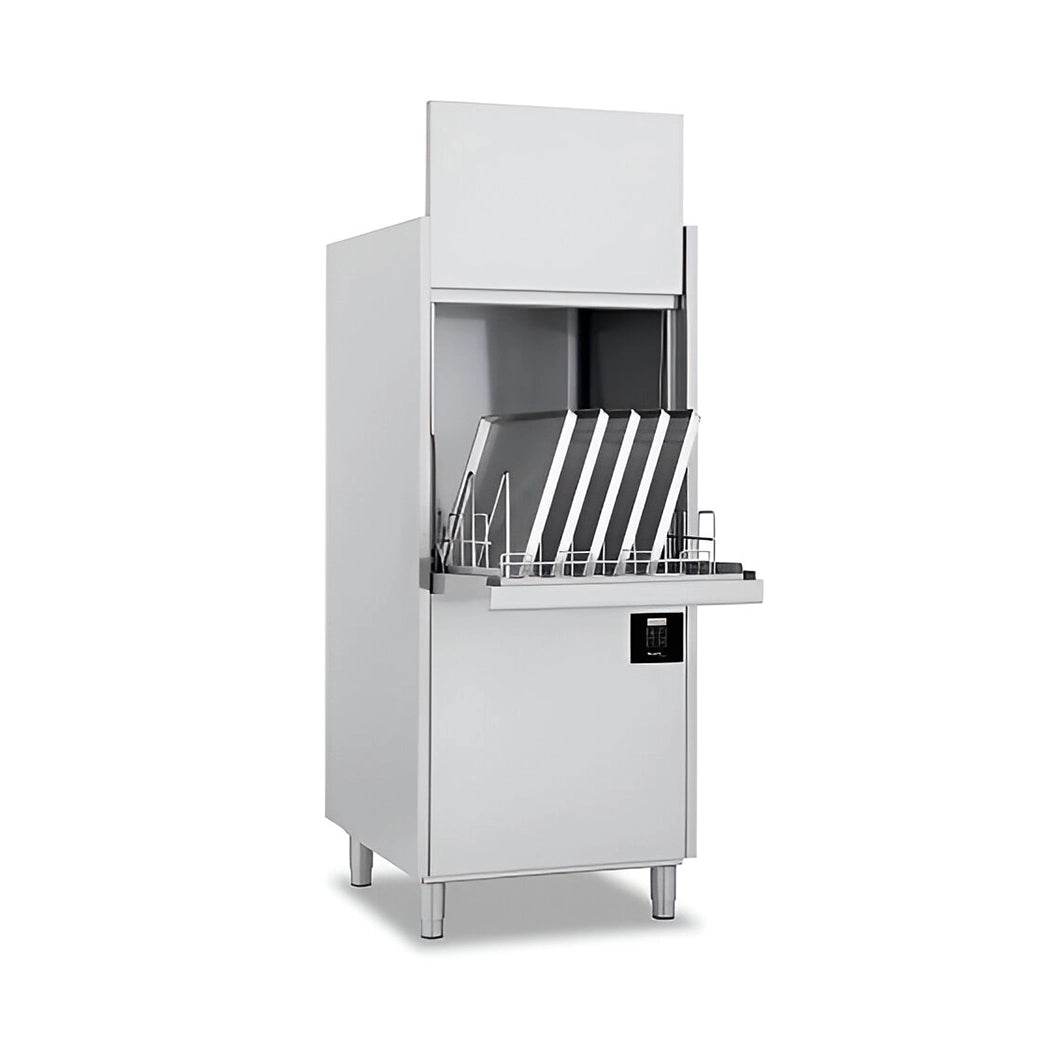• Comes with a 560 x 630 mm cassette and a 1-meter basket, along with detergent and rinse aid dispensers, and connects to hall water for seamless integration.