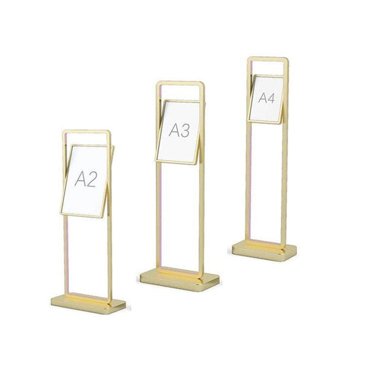 Elevate your hotel's aesthetic and communication with our exquisite Notice Board A4. Featuring a sturdy gold metal frame, anti-glare cover, and dimensions of L 120 x W 45 x H 75 cm, this display stand seamlessly blends style and functionality. Impress guests with a touch of luxury, showcasing product information in a sleek and organized manner. Upgrade your hotel's ambiance with this durable, sophisticated solution designed for lasting impact.