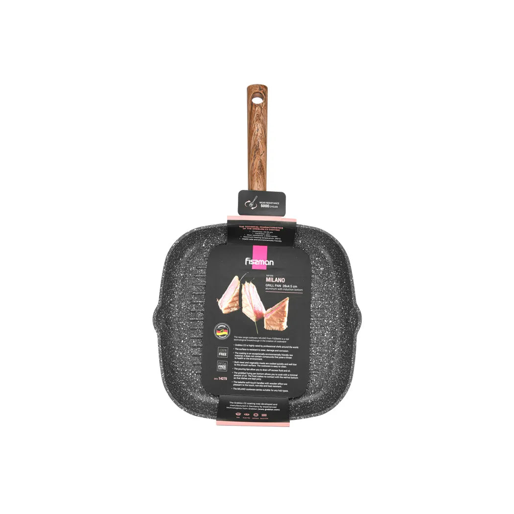 The Fissman Milano Series Aluminum Non-Stick Square Grill Pan, 28 x 4.5 cm, embodies innovation and practicality in modern cookware. With its Greblon C2 coating, acclaimed by chefs worldwide, it guarantees durability and excellent resistance to wear and corrosion. Ideal for preparing both meat and vegetable dishes, its smooth surface ensures efficient cooking and effortless cleanup. The grill pan includes convenient draining spouts and ergonomic bakelite handles with a comfortable, non-slip grip. Compatible with all types of stoves, including induction, this pan is a testament to Fissman's commitment to quality and sustainability. Elevate your culinary standards with the Fissman Milano Series, where functionality meets enduring excellence.