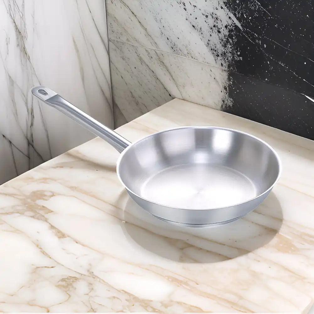 Designed with the demands of professional kitchens in mind, this Pradeep Fry Pan boasts a strong construct, suited for an array of cooking techniques. Its 32cm diameter coupled with a depth of 5.5cm provides ample space for frying and sautéing, ensuring efficient heat distribution and cooking without a lid. The 3.75L capacity makes it ideal for preparing meals in hotels, restaurants, and catering setups.