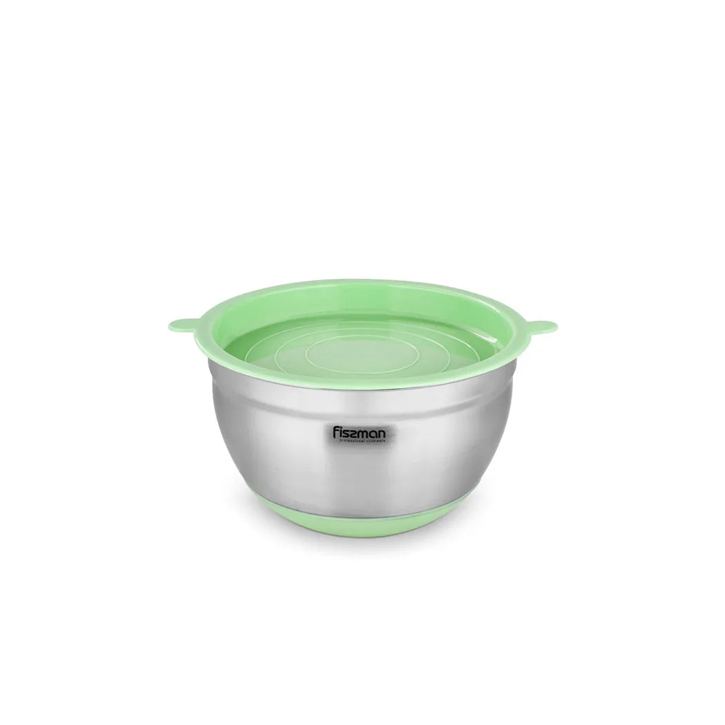 Enhance your kitchen efficiency with the Fissman 4.5-Liter Stainless Steel Mixing Bowl. Perfect for both professional chefs and hospitality environments, this bowl features durable 18/10 stainless steel construction with a scratch-resistant surface. Its stackable design saves space, and the non-slip silicone base provides stability during mixing. Designed to withstand food acids and maintain hygiene, it's equipped with high walls for efficient use with electric mixers. Complete with a green lid for easy storage, this bowl ensures practicality and durability, reflecting Fissman's commitment to quality kitchenware solutions.