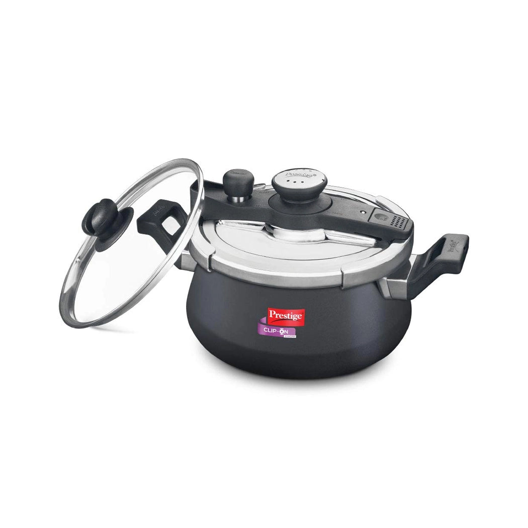 The Prestige Clip-On Svachh Handi Pressure Cooker is made of hard anodized aluminum for long-lasting durability. Its sleek black finish matches any professional kitchen décor. Its enormous five-liter volume makes it excellent for hotels, restaurants, and catering businesses. The unique Clip-On lid accommodates different utensils in the range, providing exceptional versatility. The distinctive Svachh lid design avoids messy spills, resulting in a cleaner cooking environment. This cooker also has a useful pressure indicator for added safety. Saute, steam, fry, boil, cook, or serve with ease using this all-in-one kitchen tool, which is meant to transform your cooking experience.
