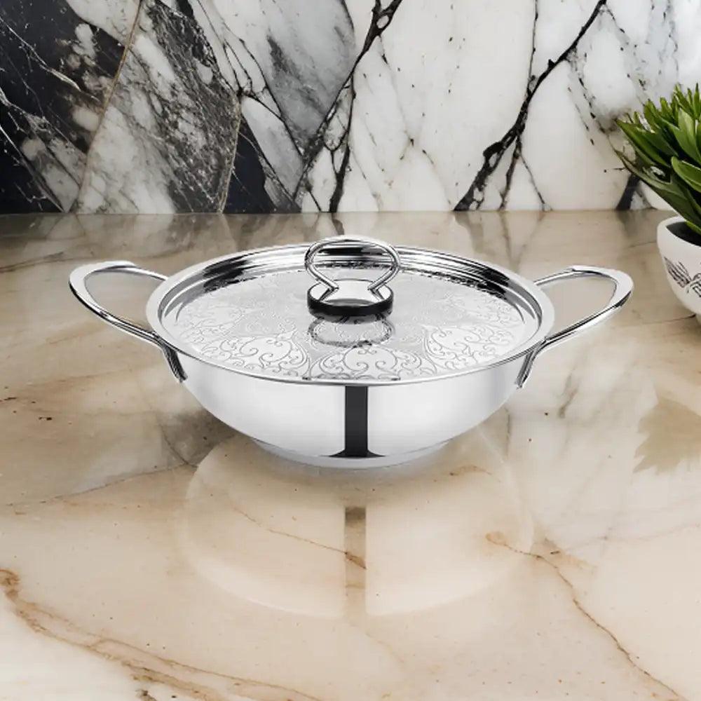 Designed for the discerning culinary establishments, the Pradeep Kadai combines functionality with style, featuring a high-quality stainless steel body and an artistically crafted lid. Its capacity is perfect for a variety of dishes, ensuring both durability and elegance in professional kitchens.