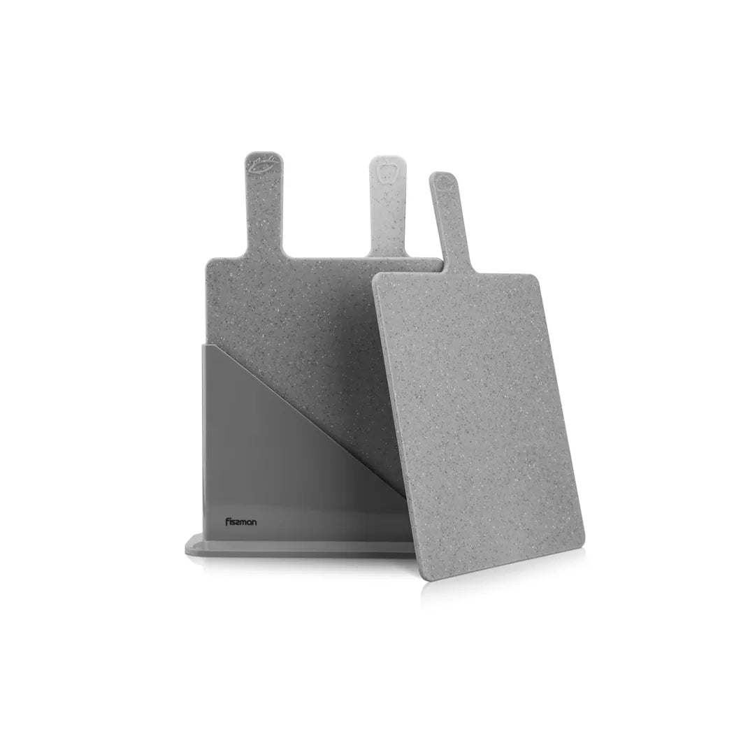 The Fissman 3-Piece Marble Colored Cutting Board Set in grey, each board measuring 32x19cm, offers functional elegance for culinary tasks. Featuring color-coded boards for fish, meat, and vegetables with index-style tabs, these boards are made from eco-friendly plastic that resists odors and abrasion. They maintain knife sharpness and include a functional stand for easy storage. Dishwasher safe and durable, these boards are ideal for professional kitchens and the hospitality industry, reflecting Fissman's commitment to quality and reliability in kitchen essentials.