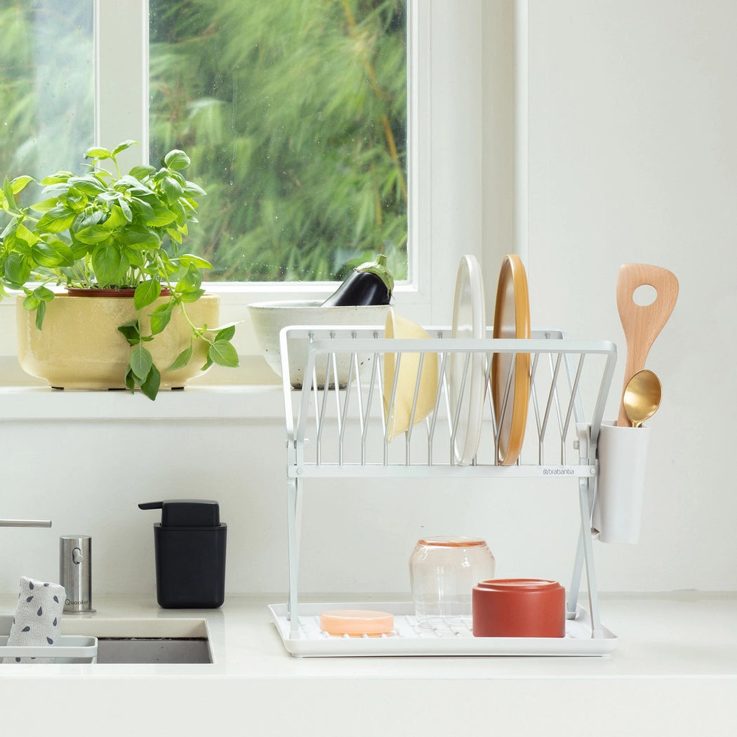 Experience the convenience of effortless dish drying with the Brabantia SinkSide Foldable Dish Drying Rack. Expertly designed to accommodate up to 13 plates alongside pots, pans, and glassware, this rack integrates seamlessly into your kitchen setup. Featuring a removable basket for cutlery and utensils, this drying rack is as practical as it is stylish, allowing for easy collapse and storage. Its compact design and aesthetic appeal make it an ideal addition to any kitchen, ensuring a spotless and organized space.
