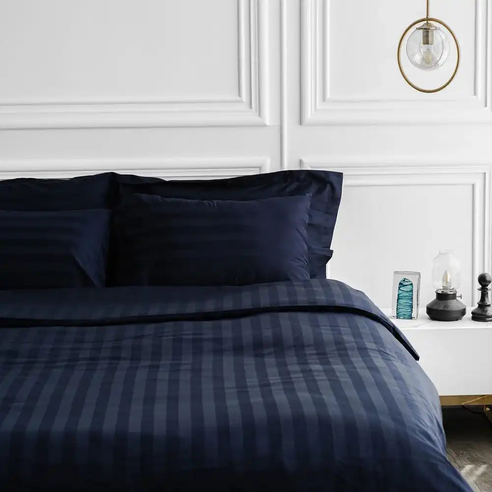 Designed for the upscale hotel industry, this Eternal Stripes Navy Blue Flat Sheet blends luxury and practicality. Crafted from 100% cotton sateen with a 250 thread count, it offers a silky, smooth texture. Its 160x280 cm dimension ensures a generous fit for single beds. The wrinkle-free finish promotes effortless maintenance, ideal for busy hospitality environments.