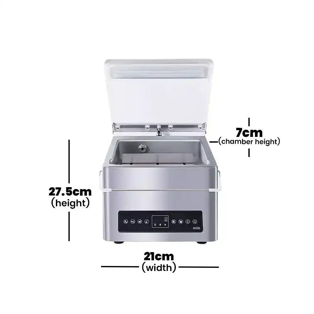 The THS HVC-210T Stainless Steel Automatic Table Vacuum Packaging Machine, a culinary game-changer for cafes, hotels, and restaurants. With low power consumption, precision sealing, and a sleek stainless steel design (40.4 x 20.9 x 20.5 cm), this space-efficient marvel elevates food preservation. Impress customers with unmatched versatility, and future-proof your kitchen with Mariot's cutting-edge technology. Seal in the freshness, flavor, and reputation of your establishment today.